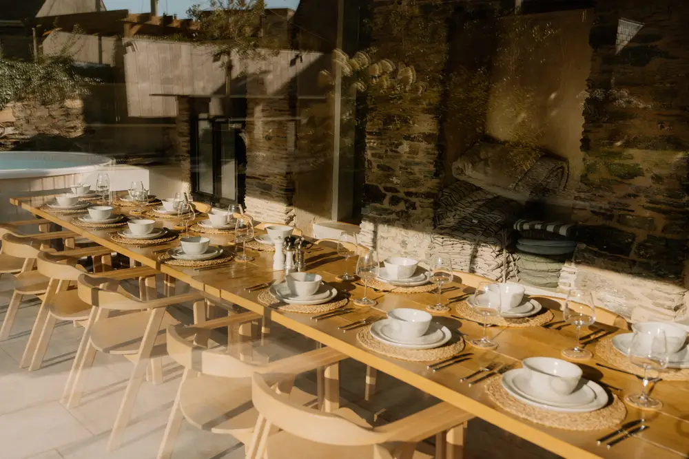 Huge dining tables, both indoor and outdoor, invite guests to linger: sharing food, stories and wine.